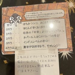 自分は上記メニューを注文し、妻は「野菜カレーセット」娘は「お子さまカレーセット」を注文。辛さは、0~5辛まで選ぶことができる。