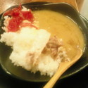 白いカレーということですが、うーん、なんでしょ。昔守谷駅にあったザボンというラーメン屋で提供していたカレーと同じような味だなぁ、非常にとろみがあって脂系なんだけど凄く美味しいという。豚骨スープでも入っているのでしょうか?肉はチャーシューが乗っていてこれもトロトロ。